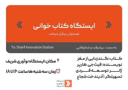 ایستگاه کتاب خوانی در ایستگاه نوآوری شریف با همکاری مجموعه همخوان برگزار میکند. از سه شنبه ۲۸ مرداد به مدت چهار هفته دوره کتاب خوانی کتاب (گند زدایی از مغز)…